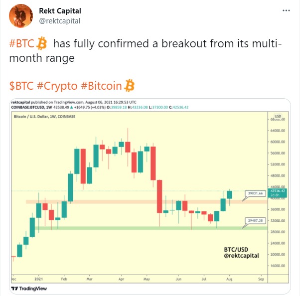 Đà tăng mạnh lên 43.210 USD của Bitcoin là một bước phát triển lớn đối với giá theo ghi nhận của nhà phân tích có biệt danh Rekt Capital, vì đây là lần đầu tiên BTC thoát ra khỏi phạm vi giao dịch nhiều tháng của nó.