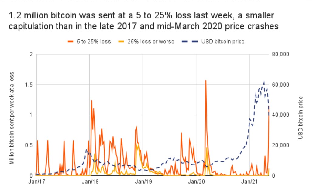 Tuy nhiên, đây là số lượng bitcoin bị lỗ ít hơn so với các đợt giảm giá vào cuối năm 2017 và giữa tháng 3 năm 2020. Điều đó cho thấy rằng tuần trước không phải là đợt đầu tư tồi tệ nhất của những holder trong lịch sử bitcoin.