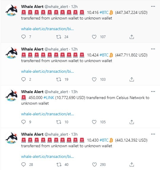 Tài khoản chuyển theo dõi tiền điện tử nổi tiếng Whale Alert đã phát hiện ra 9 giao dịch Bitcoin khổng lồ, mỗi giao dịch mang từ 10.200 đến 10.400 Bitcoin.