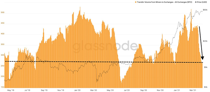 Việc chuyển trực tiếp từ ví của thợ đào sang sàn giao dịch cũng đã giảm đáng kể trong những tuần gần đây, giảm từ mức trung bình động 30 ngày gần 450 BTC vào giữa tháng 3 xuống còn 275 BTC vào ngày hôm nay.