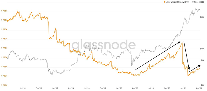 Dữ liệu từ Glassnode cho thấy rằng số dư BTC của các thợ đào đã tăng lên kể từ cuối tháng 3, sau khi dòng tiền chảy ra nhiều trong suốt tháng 1 và liên tục giảm lượng bán trong tháng 2 và đầu tháng 3.