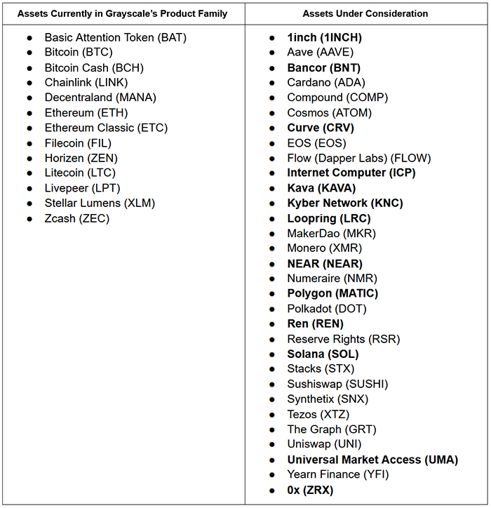 Ngày 26 tháng 2, Grayscale Investments đã tiết lộ danh sách rút ra các đồng tiền điện tử mà họ lựa chọn để tạo ra các ý tưởng mới cho chiến lược trong tương lai. Grayscale đã xem xét đến 23 altcoin cho các sản phẩm đầu tư mới.