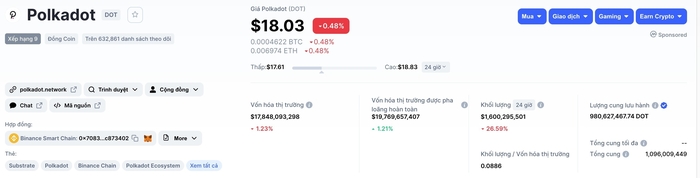 Tại thời điểm mình viết bài này (03/08/2021), giá 1 DOT = 18,03 USD với tổng vốn hoá thị trường là $17,599,218,137 USD và xếp hạng 9 trên CoinMarketCap.
