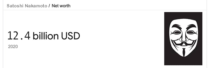 Jeff Bezos là người giàu nhất thế giới, nhưng một ngày nào đó nếu Bitcoin vượt qua một mức định giá nhất định thì Satoshi Nakamoto sẽ là người giàu nhất nếu ông ấy vẫn còn sống. Hiện nay, Satoshi Nakamoto là người giàu thứ 157 trên thế giới và Bitcoin sẽ phải vượt qua sáu chữ số để vượt trội hơn giá trị ròng của người sáng lập Amazon.