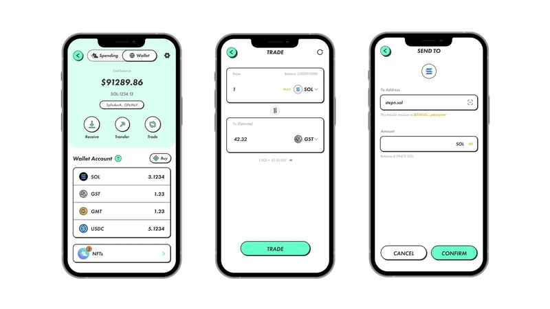 - Wallet & Swap: Người dùng có thể mua tiền điện tử thông qua cổng Binance; swap token sang các loại tiền điện tử khác và send, deposit token/NFT.